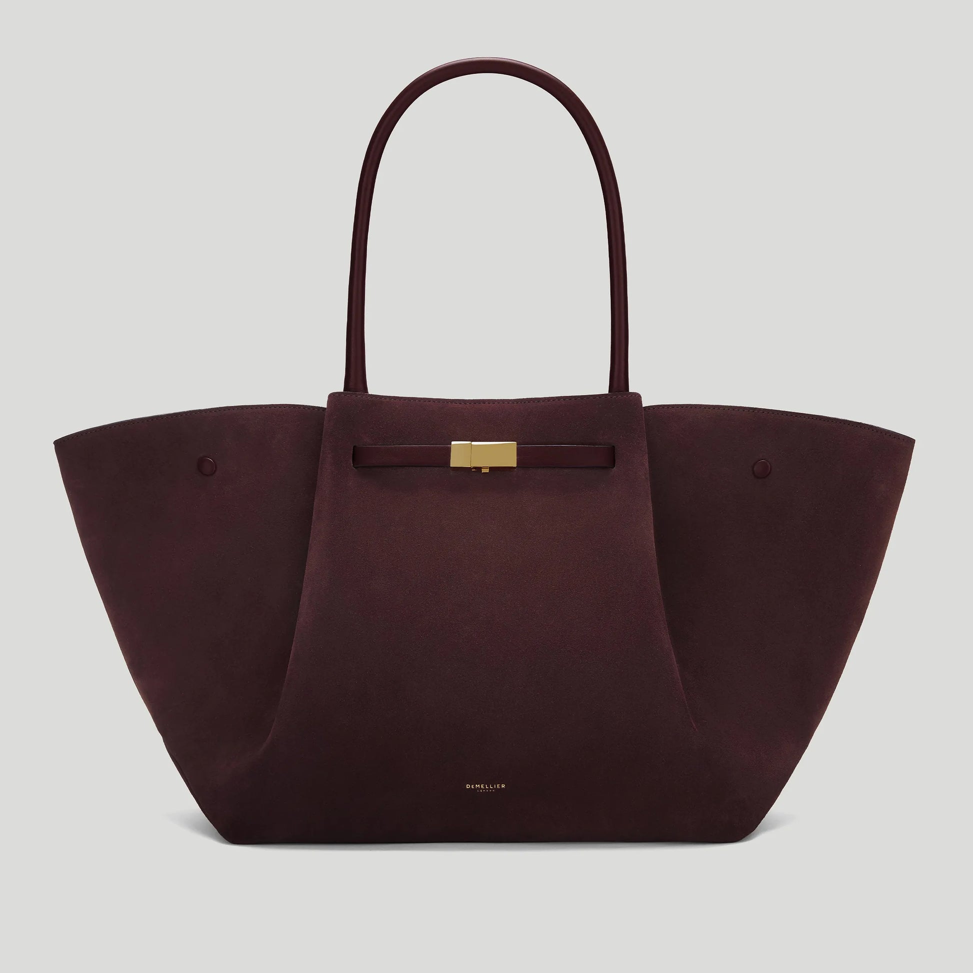 Exterior: Double top handles, metal feet, unique triangular fold design, foil embossed DeMellier logo.